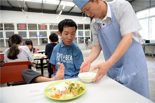 除了在食堂用餐时需要食堂工作人员帮他取卡刷卡,并将餐盘端到座位上以外,日常生活起居和学习彭超几乎都能流畅应对。